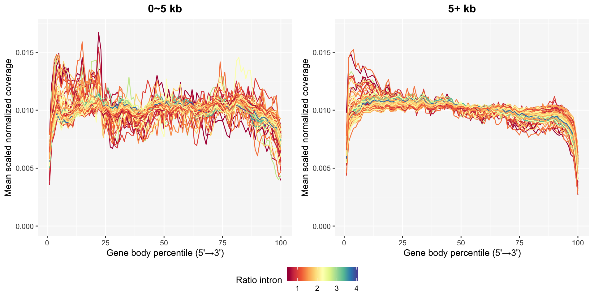 Genes are separated into two groups to compare base coverage patterns in short and long genes. 0~5 kb and 5+ kb cover 96 and 865 genes, respectively.