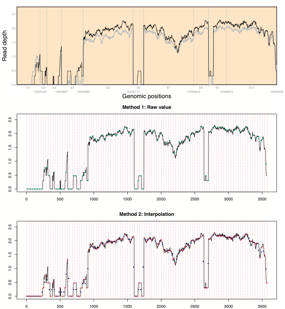 In our package, gene length normalization has two options to select read depth at the region: raw value and interpolation. After evenly dividing genomic positions by the number of regions (red vertical broken lines), suppose that both sides and center of regions are x-values of odd and even points, respectively. While the first method finds read depth at even points (green points), and the second one finds geometric mean (blue points) using read depth at odd points (red points). We recommend using the gene length normalization methods for gene length is at least 2\(\times\)the number of regions+1 to secure minimum read depth selection across genes.