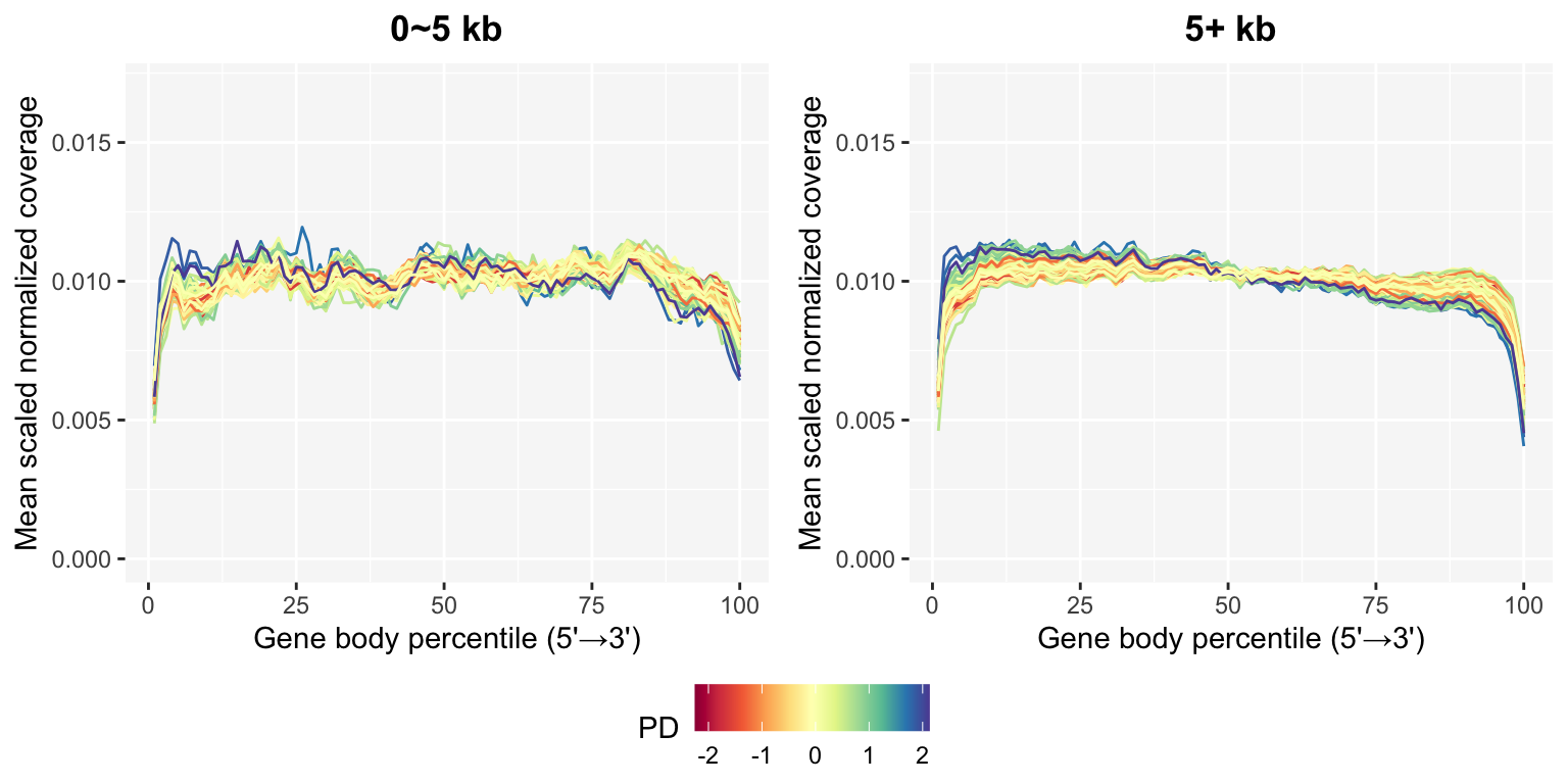 The gene body coverage plot from Data Processing can be updated after removing suboptimal samples using the plot_GBCos() function. The coverage patterns become much more stable, especially in the long genes.