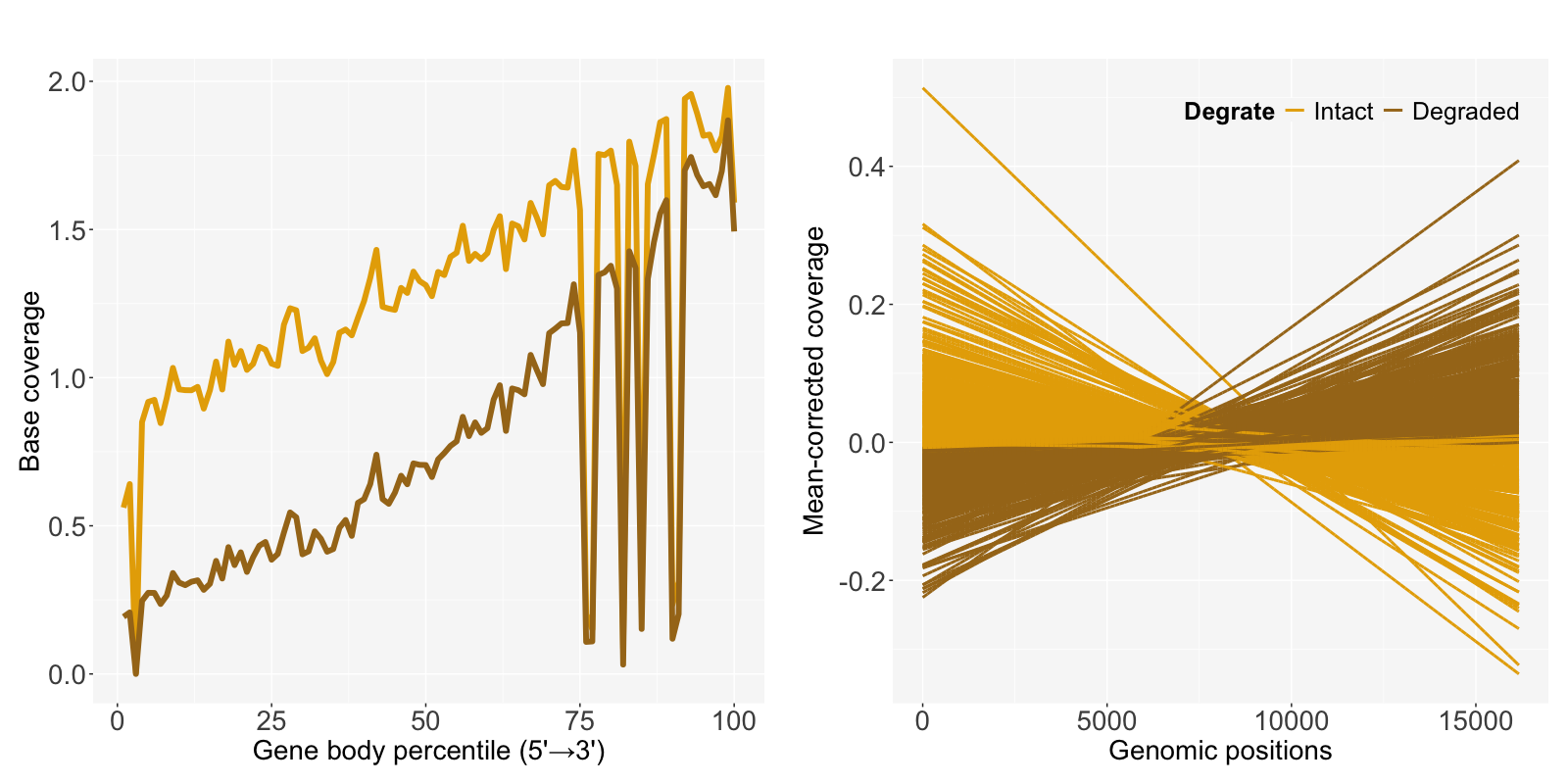 In the mean-corrected coverage figure, each sample is categorized as Intact or Degraded based on the median value of decayRate, enabling comparison of degradation effects on base-level coverage. The degraded samples having relatively larger slopes show lower coverage.
