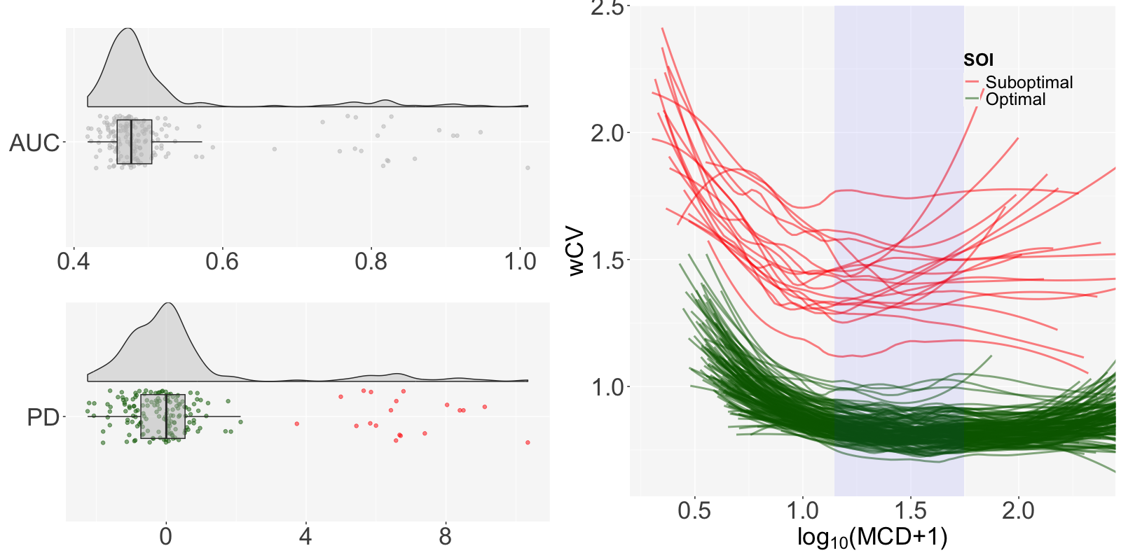 The SOI plot shows the distribution of AUC and PD and the shape of the regression by sample quality.