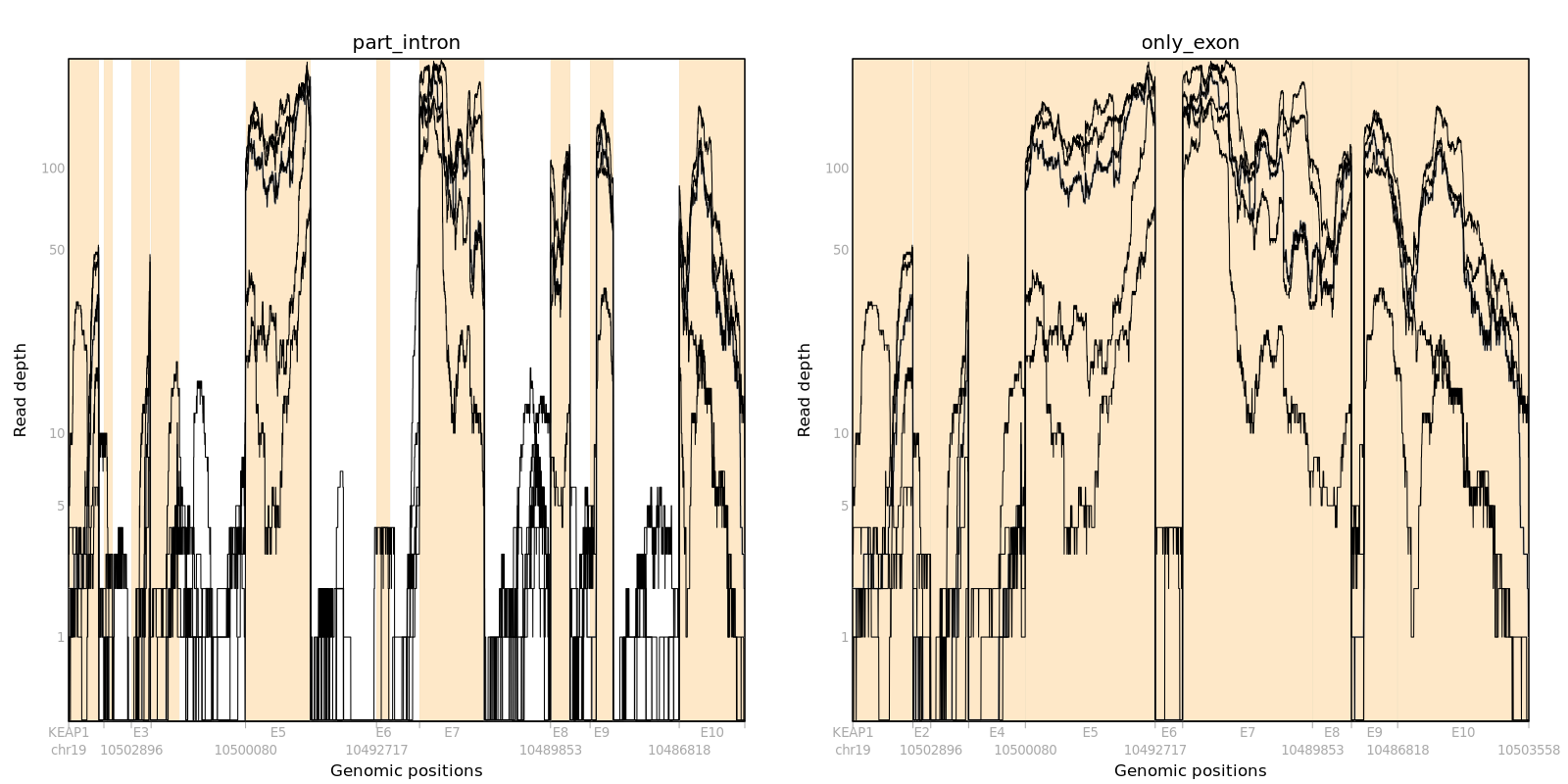 For instance, we can make pileup and compare coverage plots of part_intron and only_exon using gene KEAP1 and the 5 samples.