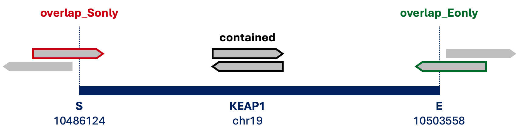 *_contained.bam: both paired reads are in the genome region (black line)*_overlap_Sonly.bam: one of paired reads overlaps with the start genomic position (red line)*_overlap_Eonly.bam: one of paired reads overlaps with the end genomic position (green line)